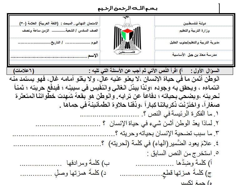 امتحان عربي نهائي سادس ف1