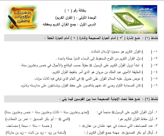 أوراق عمل وبطاقات علاجية في التربية الإسلامية للصف الثامن الفصل الأول 2019
