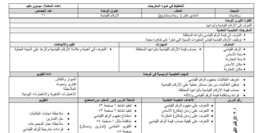 نموذج تخطيط الوحدة الثالثة (الارقام القياسية) لمادة الرياضيات للصف الحادي عشر يجعل الطالب قادر علي التعرف إلي قيمة الرقم القياسي بأنواعه المختلفة ، وتوظيف الأرقام القياسية لقياس المتغيرات التي تطرأ علي ظاهرة معينة .