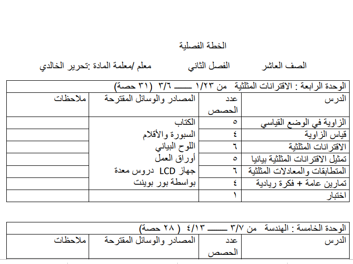 خطة فصلية في الرياضيات للصف العاشر الفصل الثاني