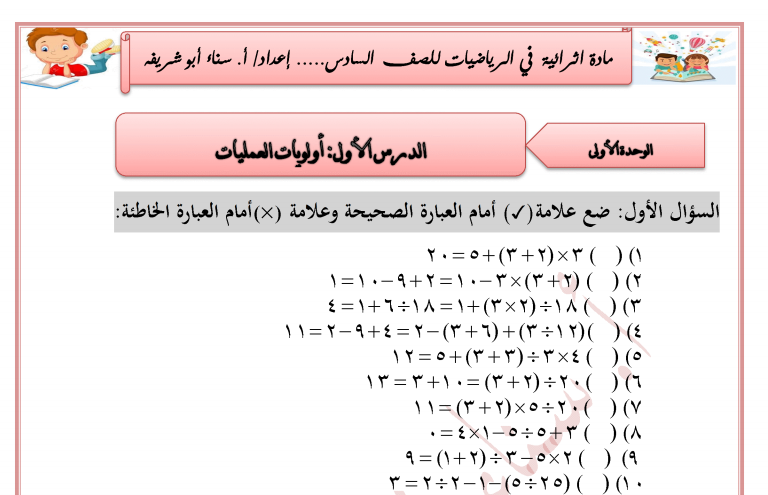 يتكون هذا الملف من مادة اثرائية في الرياضيات للصف السادس الفصل الأول، وتكون الاسئلة عبارة عن ضع علامه صح أو خطأ،أوجد ناتج ما يلي،أكمل العبارات التالية.