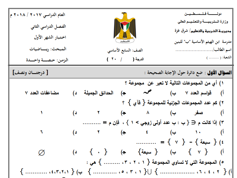 اختبار الشهر الأول في الرياضيات للصف السابع الفصل الثاني