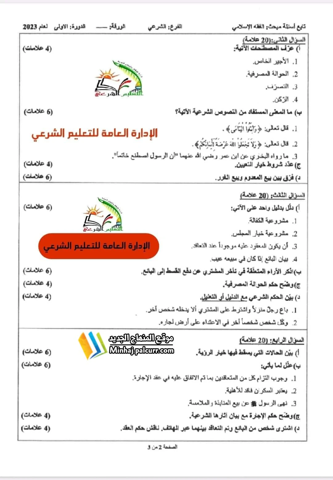أسئلة امتحان الفقه الإسلامي للفرع الشرعي 2023
